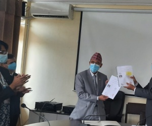 Exchange of MoU and LoA, Dr Sunil Babu Shrestha, Vice Chancellor, NAST (left) and Dr Pem Narayan Kandel, Secretary, MoFE (Right)